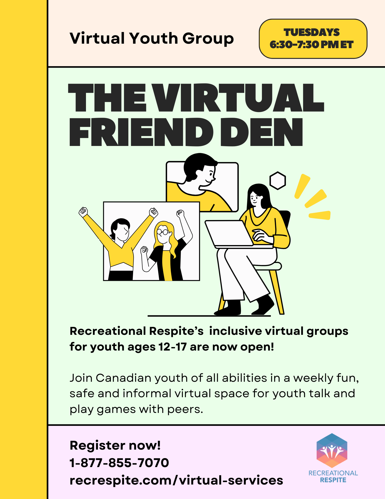 Join the Virtual Friend Den with Kelsey to explore your interests, and build new peer friendships with Canadian youth of all abilities.