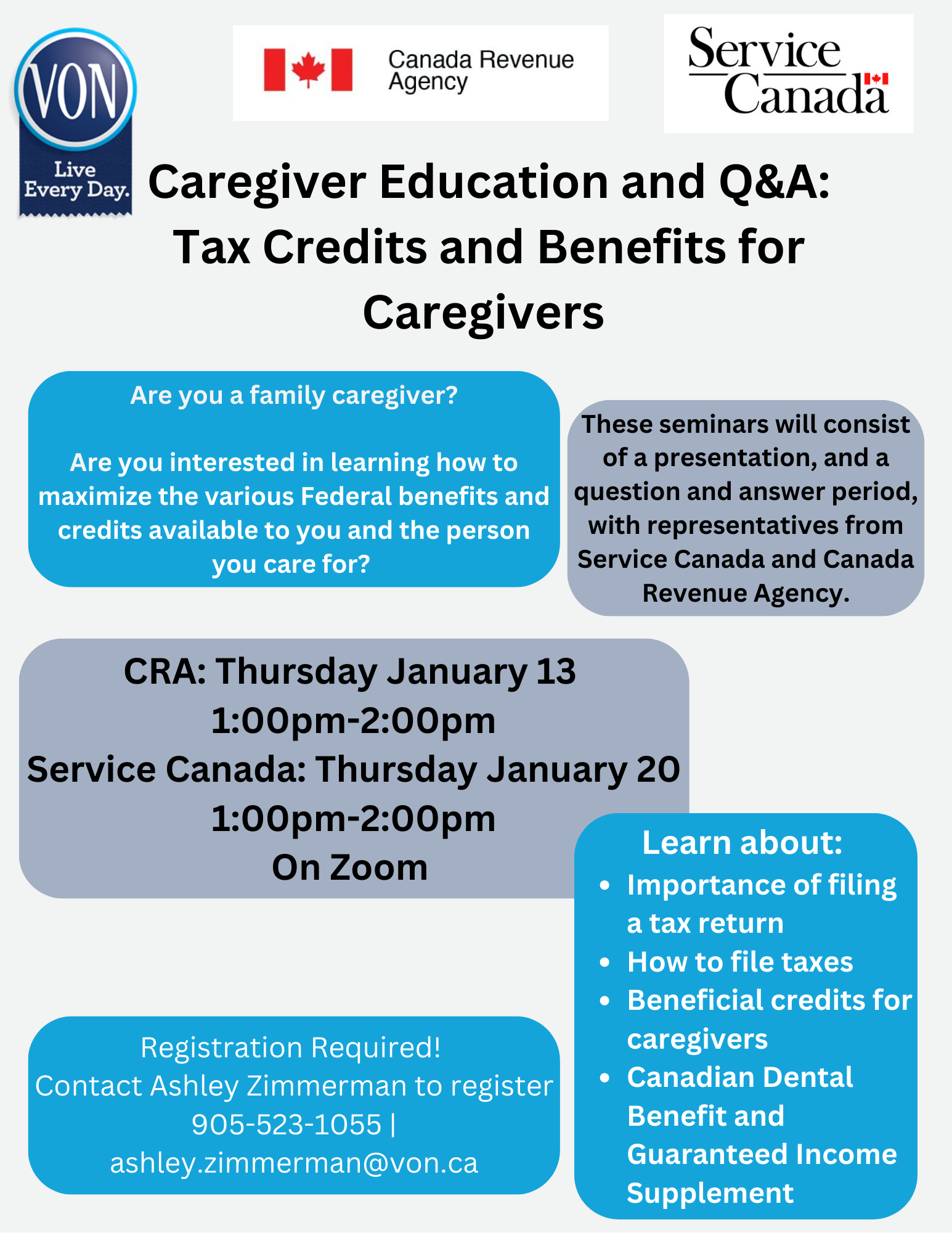 Learn about the importance of filing a tax return, and the various federal benefits and credits available to caregivers, and those they care for. These sessions are being offered on zoom, in partnership with representatives from Canada Revenue Agency and Service Canada. The seminar will have a presentation and a general question and answer period - presentation is general in content and is for referencing and resourcing only. Registration is required. Join one or both!
