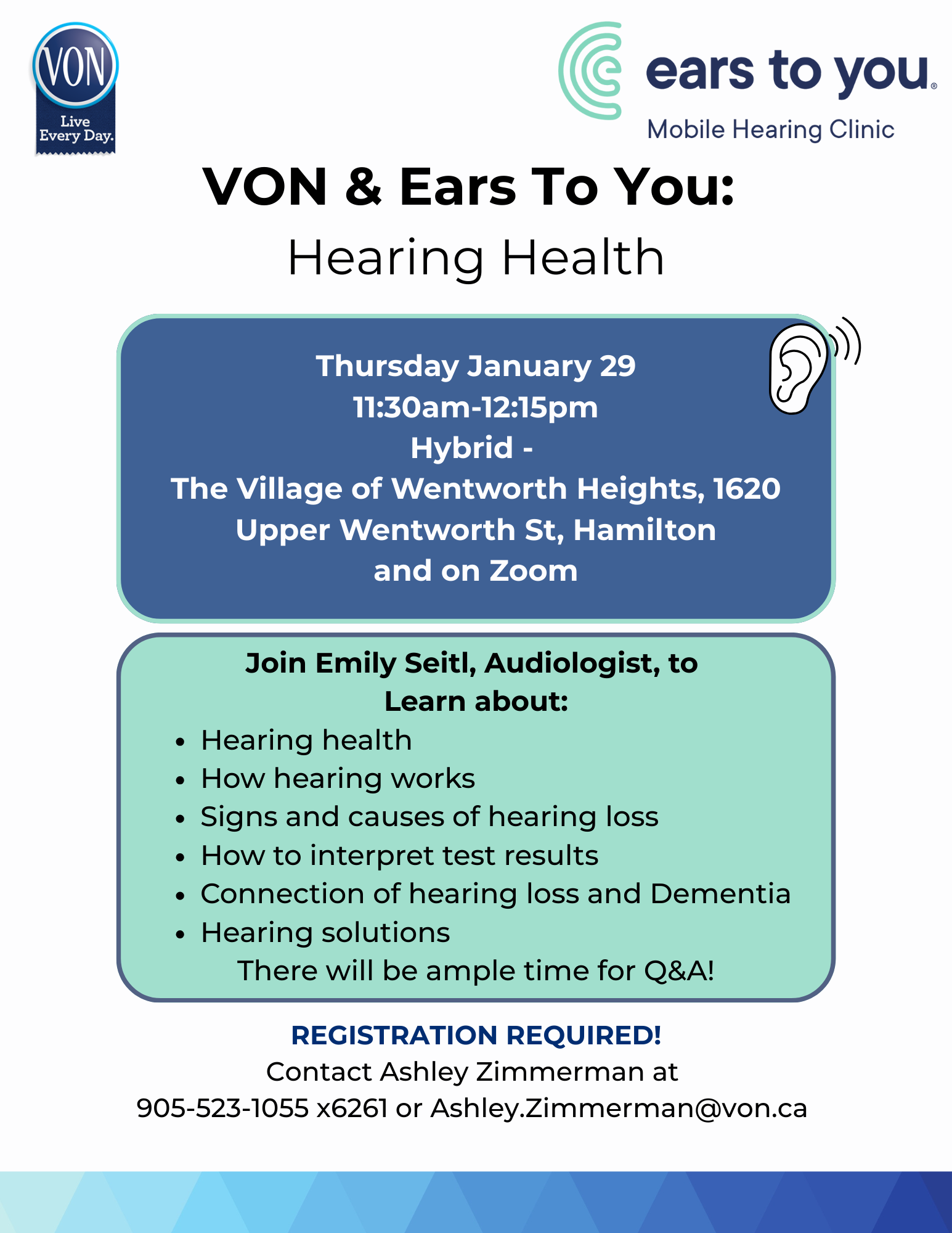 Join Emily, Audiologist, to learn about hearing health, how hearing works, signs and causes of hearing loss, interpreting test results, connection of hearing loss and Dementia, and, hearing solutions. There will be ample time for Q&A!