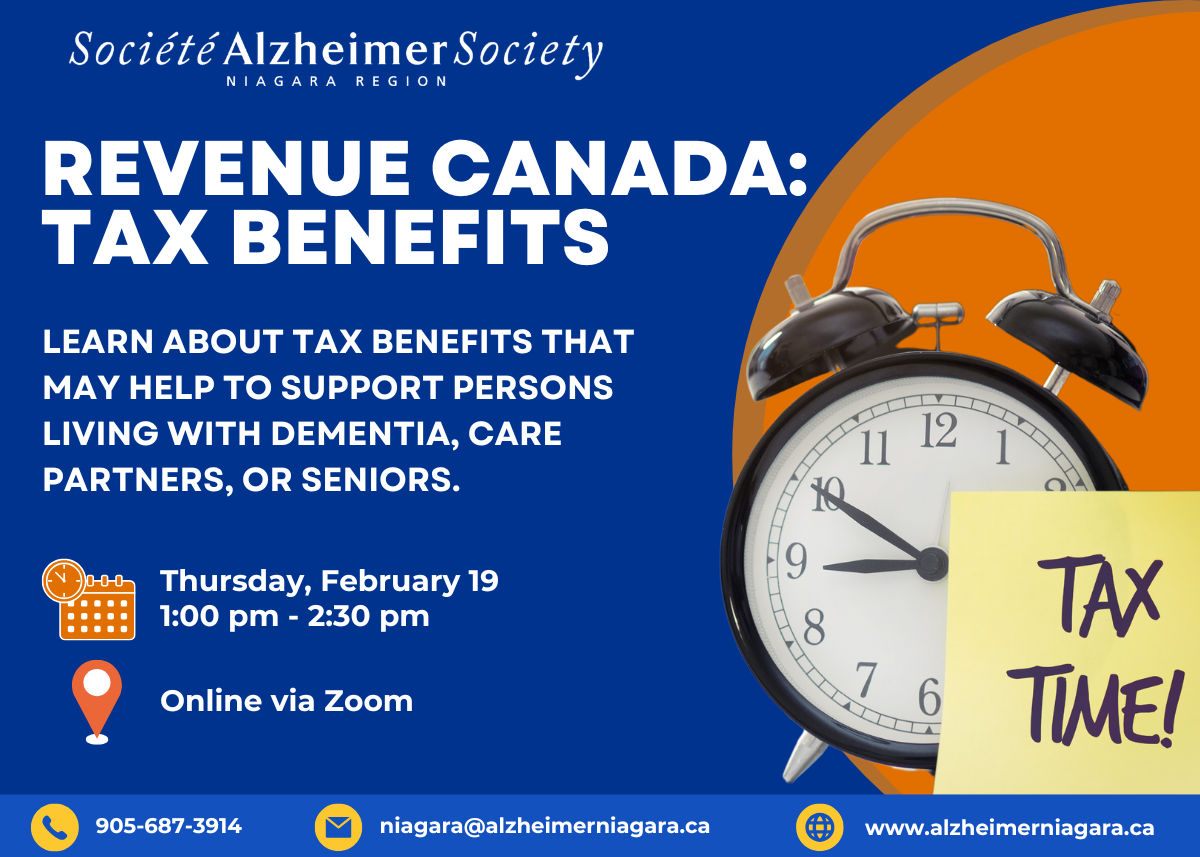 Learn about tax benefits that may help to support persons living with dementia, care partners, or seniors. We will be joined by special guest Kaitlyn Mattiozzi, CVITP and Benefits Outreach Officer.